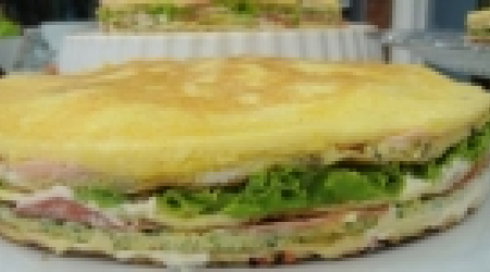 5- Na fôrma de fundo removível comece a montagem da seguinte forma: no fundo da fôrma coloque uma omelete, besunte-a com maionese e distribua 200 g de queijo prato fatiado. Sobre este queijo coloque outra omelete, besunte-a com maionese e disponha 200 g de salaminho fatiado. Coloque outra omelete, besunte-a com maionese e distribua 5 folhas de alface inteiras. Outra omelete, besunte com maionese e 200 g de presunto fatiado. Finalize a montagem com a omelete de queijo parmesão, virado com a parte dourada para cima.