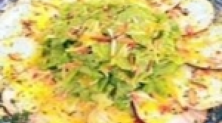 Distribua as fatias ao redor do prato, encaixando uma sob as outras. Coloque a alface no centro e regue com o molho. Espalhe as castanhas de sua preferência e o queijo ralado.